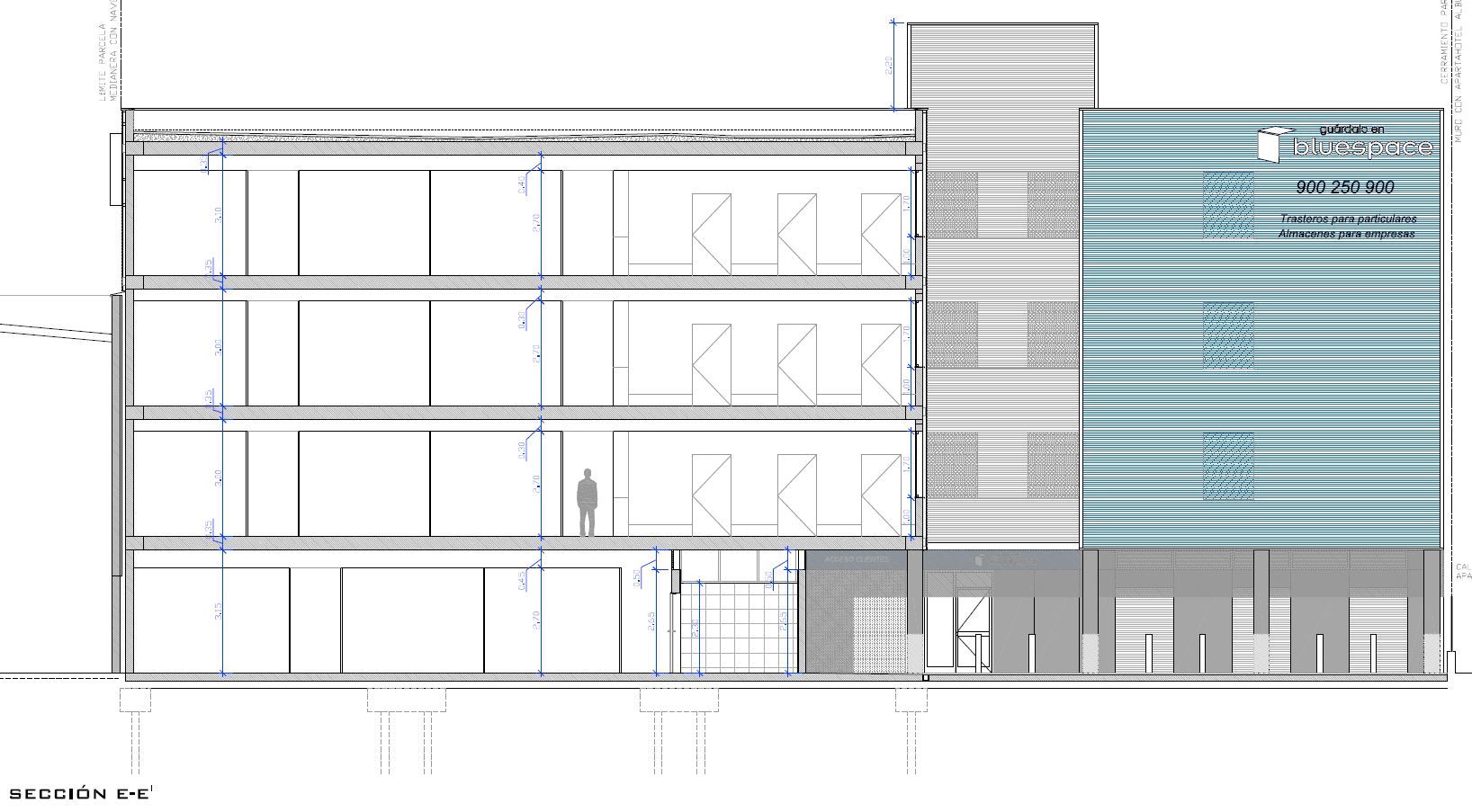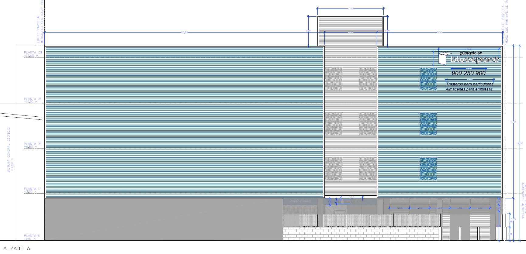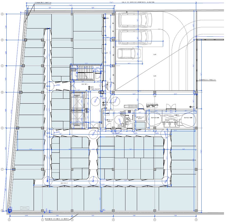 Se considerará la cota de planta baja – +6,00m (m.s.n.m)-, la cota 0,00m del proyecto. Se accede a la planta Baja del edificio a pie plano y sin desniveles a través de una puerta metálica corredera de 2,50metros de anchura que se acciona mediante teclado con código personal. El cerramiento del vestíbulo es de carpintería de aluminio con vidrio 6+6 y la puerta de evacuación también de vidrio permite iluminar de manera natural el vestíbulo de entrada.