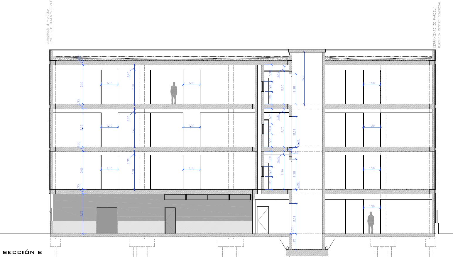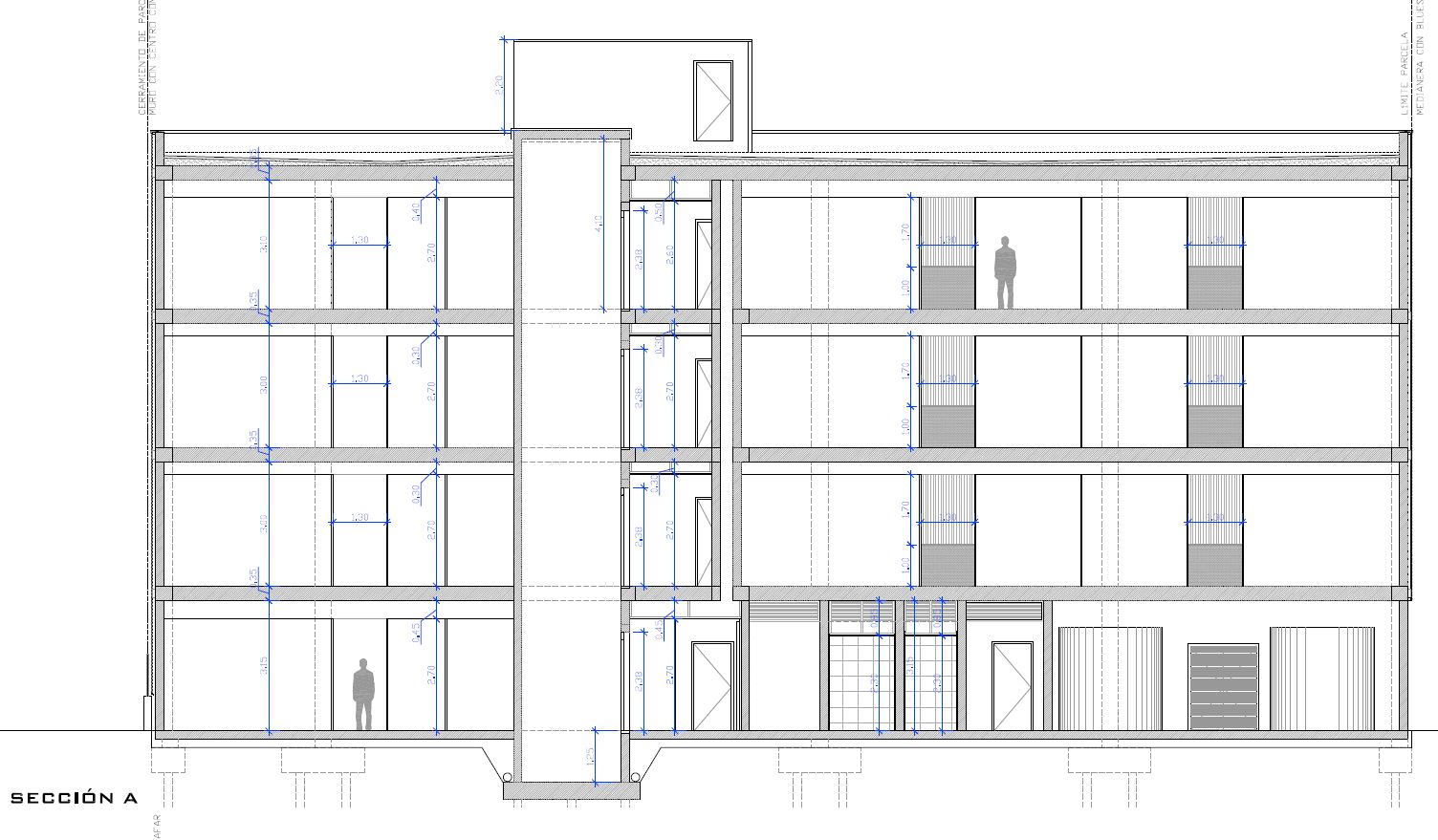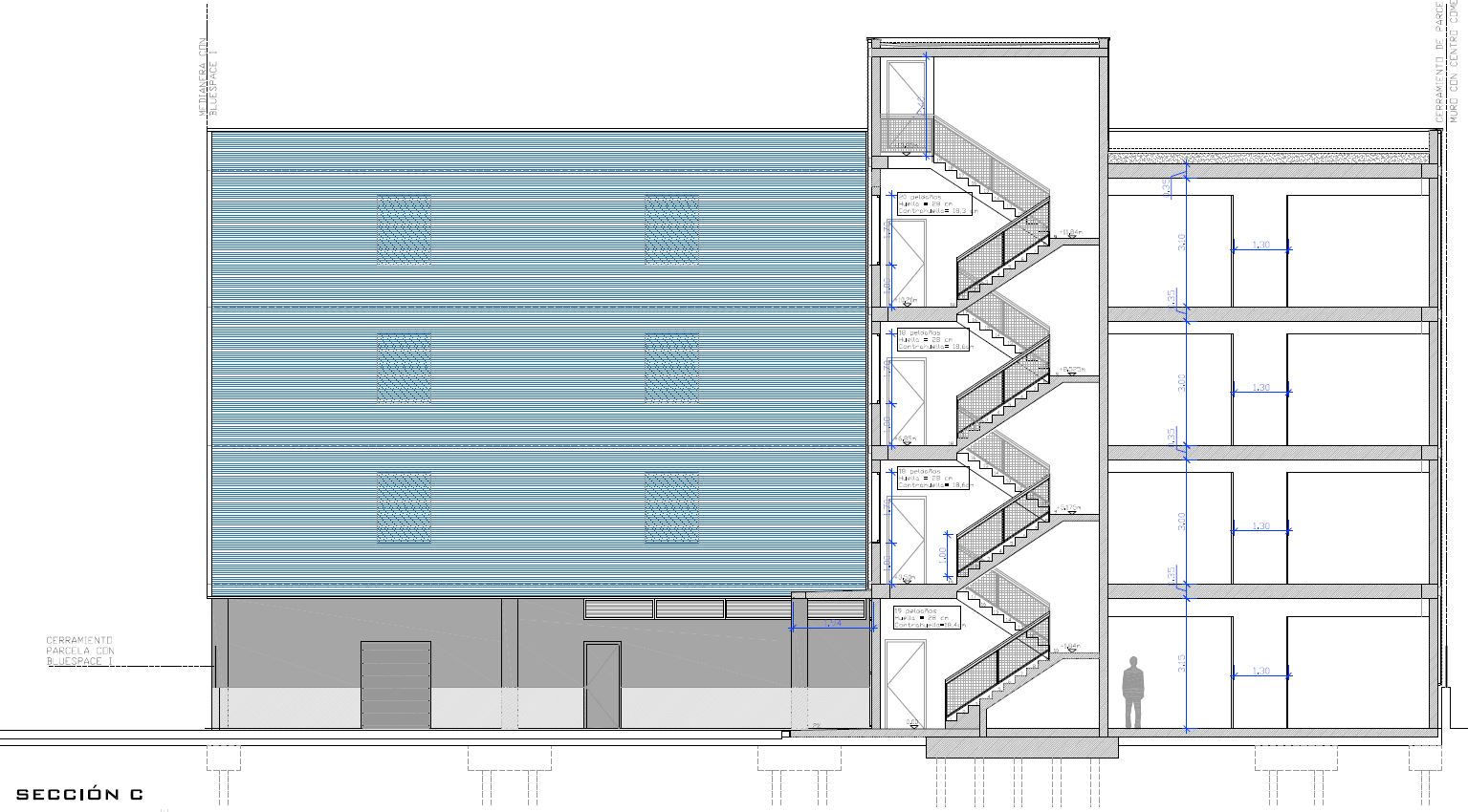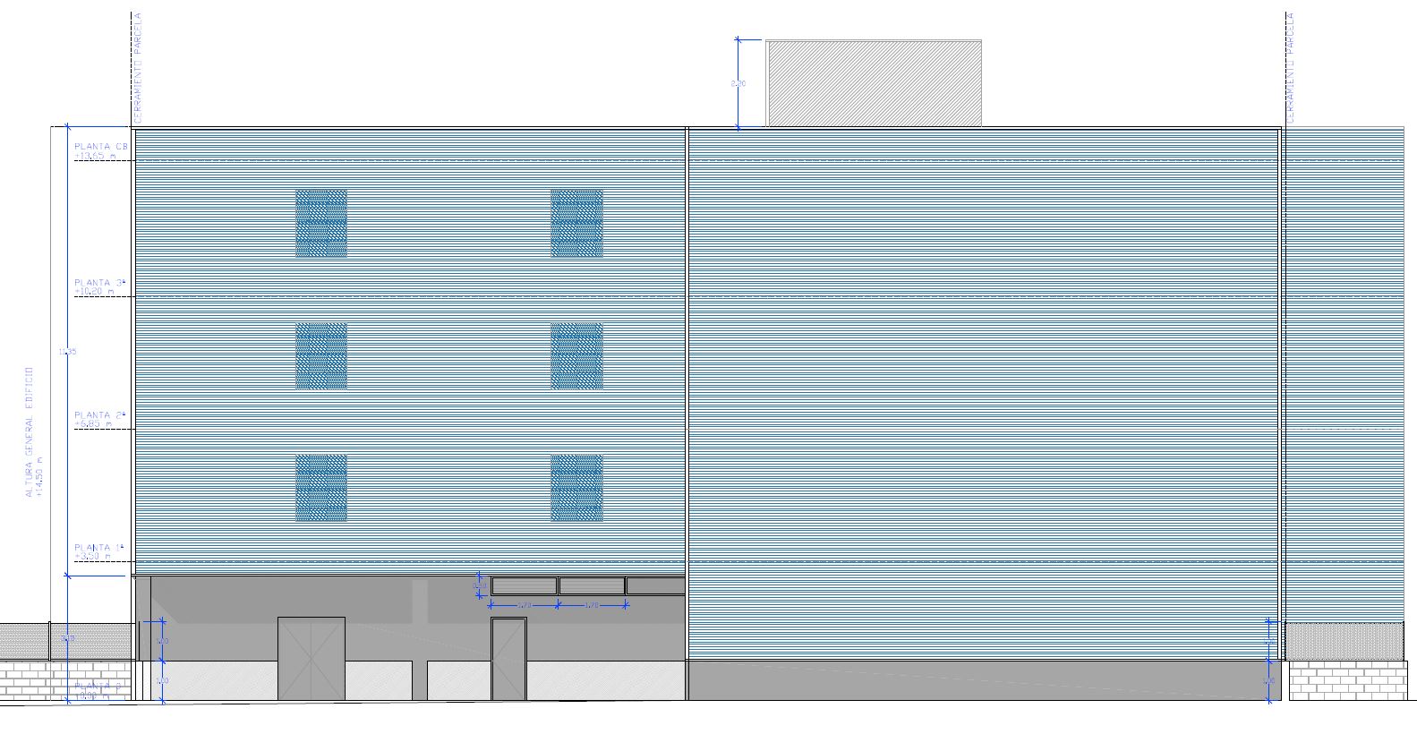 Edificio industrial de nueva planta adosado a medianeras con acceso peatonal y rodado desde calle Rabisancho, estará compuesto por cuatro plantas: P.Baja + 3, todas ellas sobre rasante. La cota en el punto medio de fachada de acceso en la C/Rabisancho es la +5,30 (m.s.n.m), y la planta baja del edificio queda 70cm por encima de este punto, a la cota +6,00 (m.s.n.m) cumpliendo así lo dispuesto en el artículo 144 punto “b” del PGOU (3/3/1992 B.O.P.) donde expone que “en la planta baja, el piso deberá elevarse 0,5m sobre la cota del terreno, medida en el punto medio del frente de fachada”