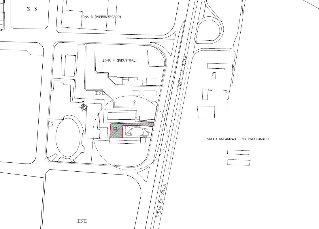 Parcela irregular con un único frente a vial (C/Rabisancho). Se conforma por un gran “pasillo” de acceso de unos 76,25 metros que te lleva desde el vial al fondo del solar, donde se desarrollará la actividad, con medidas de 27,87ml al Norte (limite medianero con Hotel), 34,48ml al Oeste (límite con Centro Comercial), 31,42ml al Sur (limite medianero con Almacén existente) y 28,53ml+5,79ml al Este (límite con parcela 02, Bluespace)